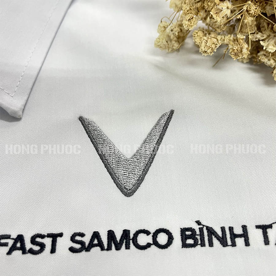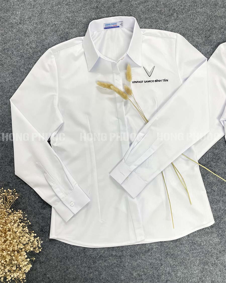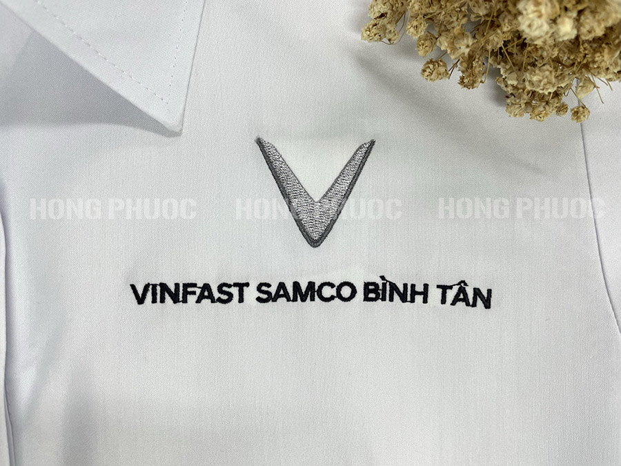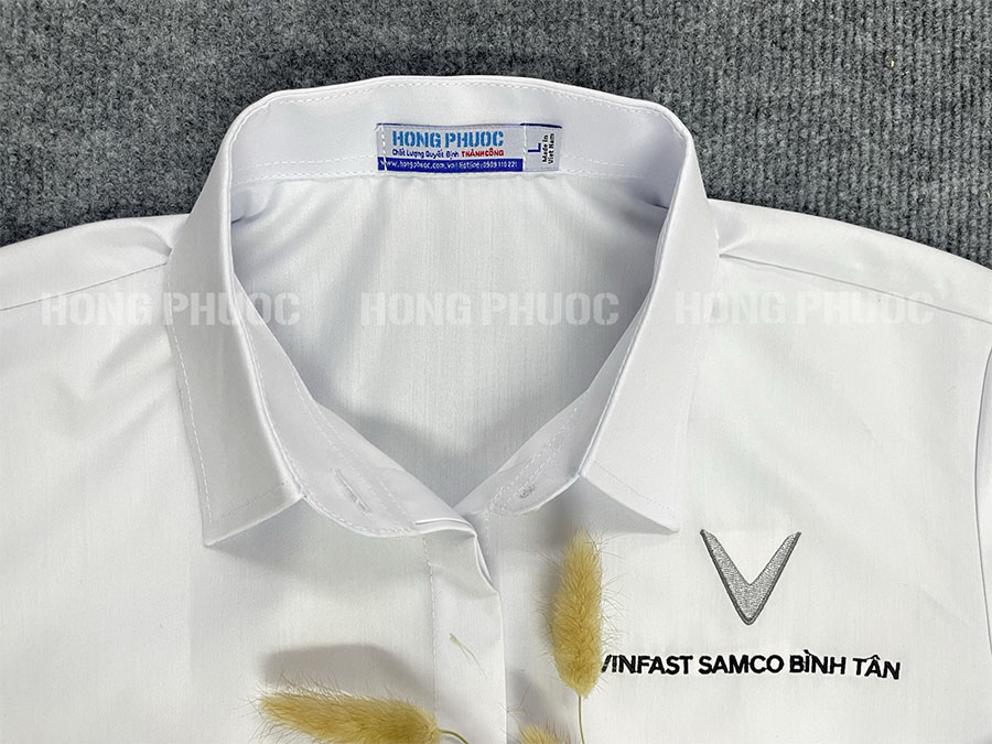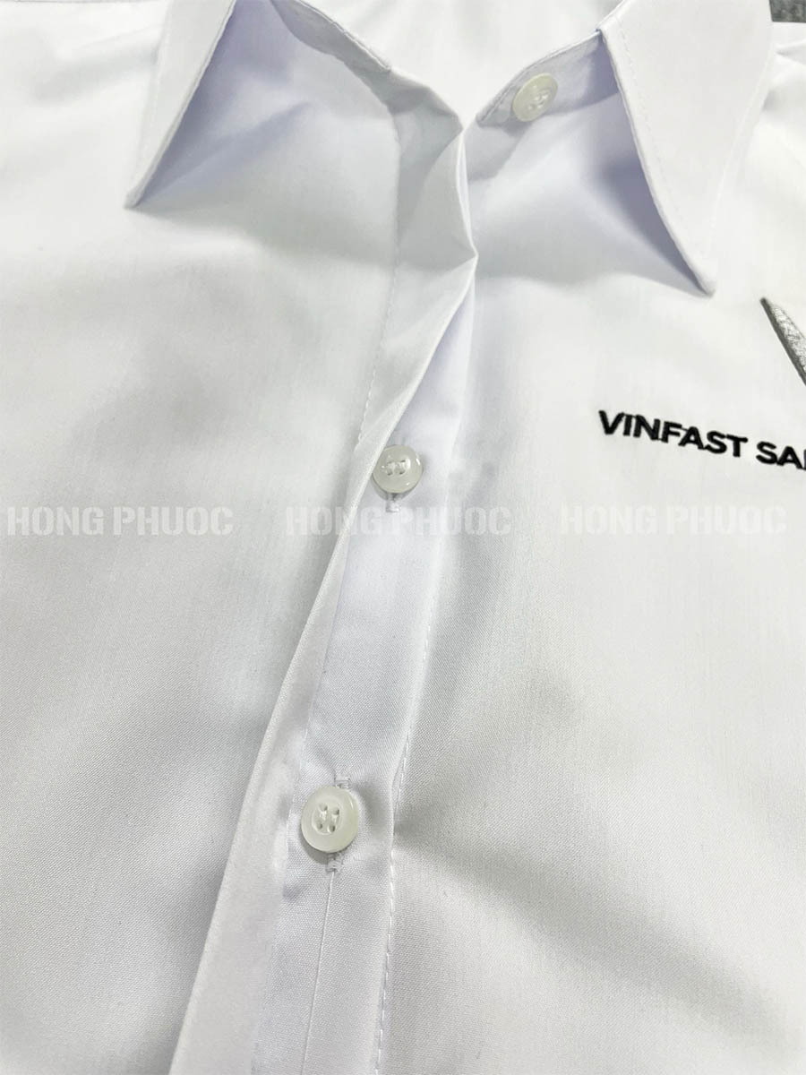 Chi tiết tinh tế: Cổ áo đứng, ve áo thanh lịch, cùng với hàng cúc đượcmay chắc chắn, thẳng hàng. Đặc biệt, logo VinFast (hoặc logo doanh nghiệp bạn) được thêu/in ở vị trí tinh tế như trên ngực áo, cổ tay, tạo điểm nhấn thương hiệu mà vẫn giữ được sự sang trọng.